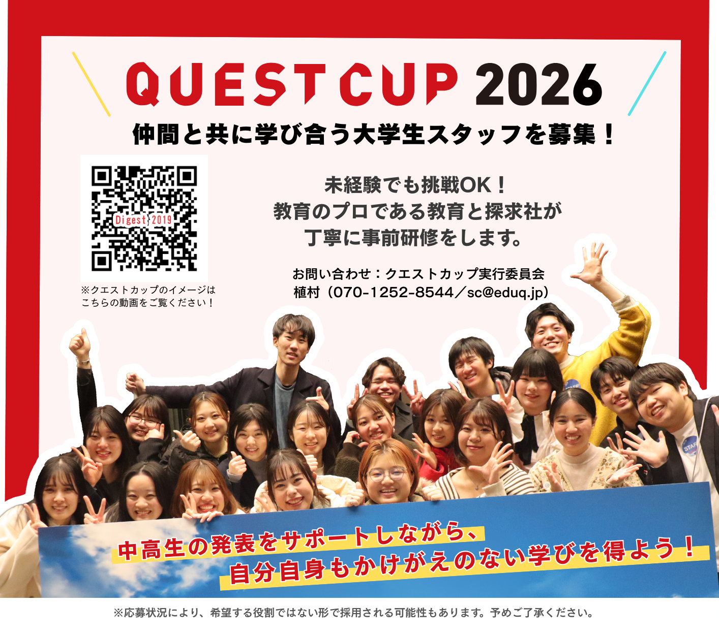 毎年2月に開催されるクエストカップ全国大会。全国から選ばれた代表チームが、企業人や有識者に向けて個性あふれるプレゼンテーションを繰り広げ、1年間の学びの成果を社会に向けて発信します。