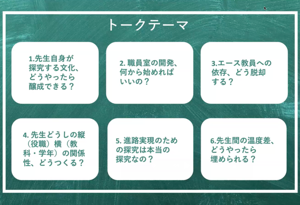 平日夕方にも関わらず、職員室や校長室、自宅、電車内など様々な場所から全国の先生方が参加。チャット欄には共感や気づきのコメントが次々と投稿される、熱量の高い場となりました。